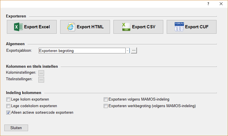 Deze optie is beschikbaar in de standaard-versie van de software. Dit is een eenvoudige export, die bruikbaar is in diverse software omgevingen (o.a. Excel). De Begroting worden geëxporteerd naar een CSV bestand op basis van de gemaakte instellingen (zie hieronder), waarna dit kan worden geopend.