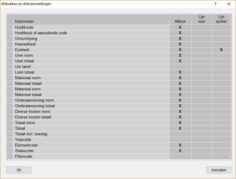 De kolommen met een X markering in de kolom 'Afdruk' worden afgedrukt. Plaats of verwijder de X door er op te klikken.