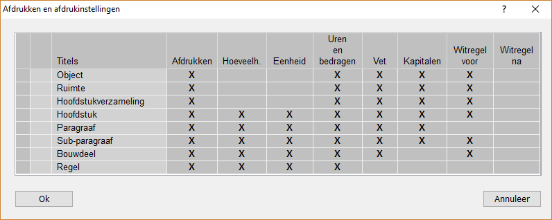 De hoeveelheid / eenheid met een X markering in de bijbehorende kolommen worden afgedrukt. Plaats of verwijder de X door er op te klikken.