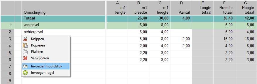 Elke regel kan een omschrijving bevatten (niet verplicht). In de kolommen A, B, C en D kunnen de corresponderende waarden worden ingevuld, lengte / breedte / hoogte / aantal.
