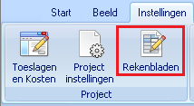 Naast het gebruik van rekenbladen op regelniveau kan via het lint, tab Instellingen, groep Project, knop 'Rekenbladen' ook worden gewerkt met dezelfde rekenbladen op projectniveau. Bij deze weergave is rechts bovenin geen blok met omschrijving en hoeveelheden zichtbaar, omdat hier ook niet wordt gekoppeld. Een werkwijze kan zijn om eerst alle uittrekwerk te verrichten en dit hier vast te leggen. Vervolgens wordt redactioneel de begroting opgesteld en hoeveelheden gekoppeld aan de reeds bestaande rekenbladen.
